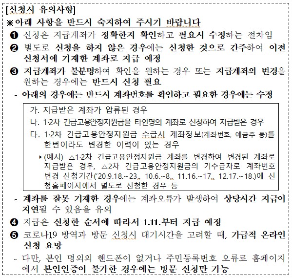 ㅇ 만약 ①지급받을 계좌 정보를 확인할 필요가 있거나 변경하고자 하는 경우, ②지급계좌가 압류된 경우, ③기존에 타인명의 계좌로 지급받은 경우, ④1차, 2차 긴급 고용안정지원금 수급 시 계좌 정보(계좌번호, 예금주 등)를 한 번이라도 변경한 이력이 있는 경우에는 반드시 계좌 정보를 확인하고 신청해야 한다.