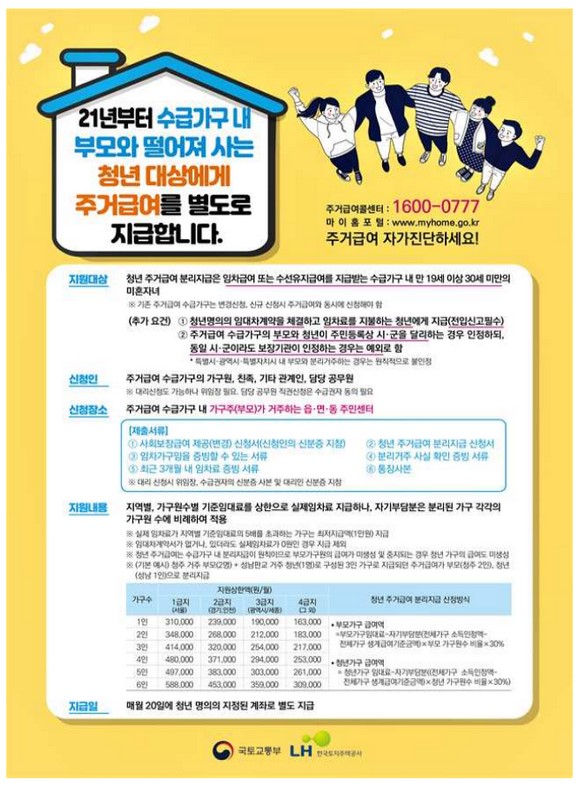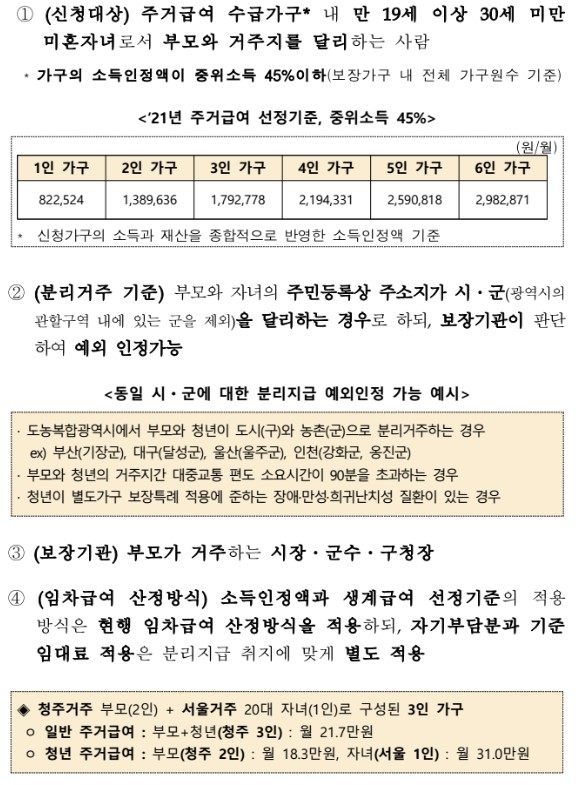 21년부터 수급가구내 부모와 떨어져 사는 청년 대상에게 주거급여를 별도로 지급