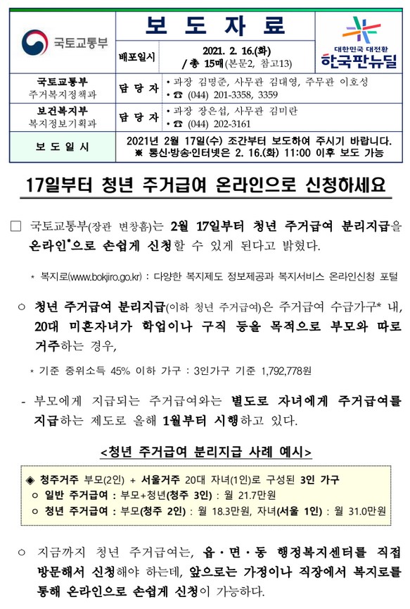 국토교통부(장관 변창흠)는 2월 17일부터 청년 주거급여 분리지급을 온라인*으로 손쉽게 신청할 수 있게 된다고 밝혔다.* 복지로(www.bokjiro.go.kr) : 다양한 복지제