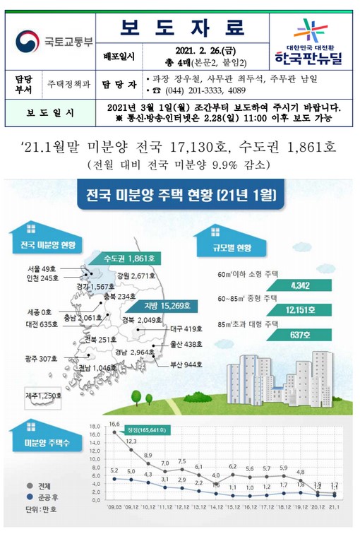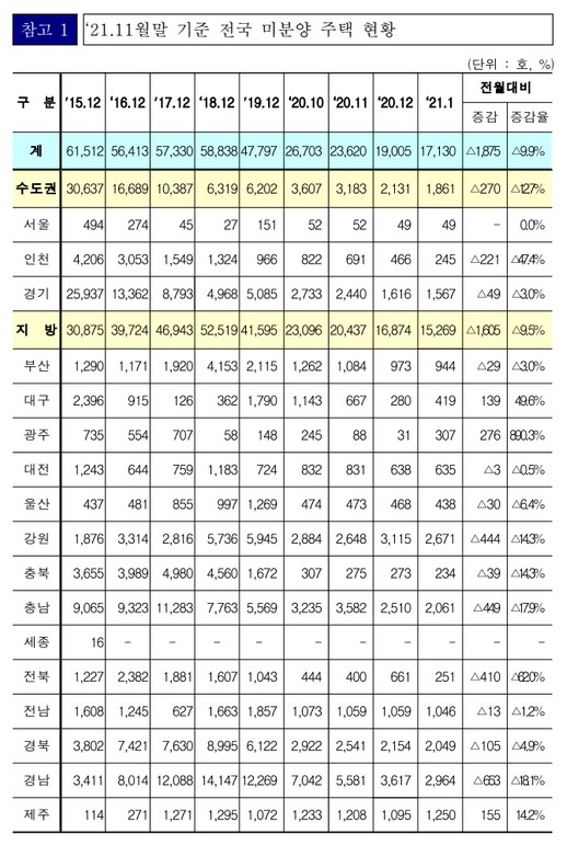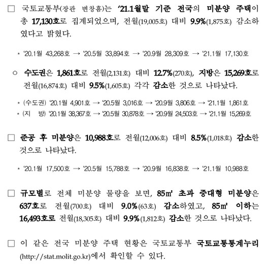 국토교통부(장관 변창흠)는 ‘21.1월말 기준 전국의 미분양 주택이 총 17,130호로 집계되었으며, 전월(19,005호) 대비 9.9%(1,875호) 감소하였다고 밝혔