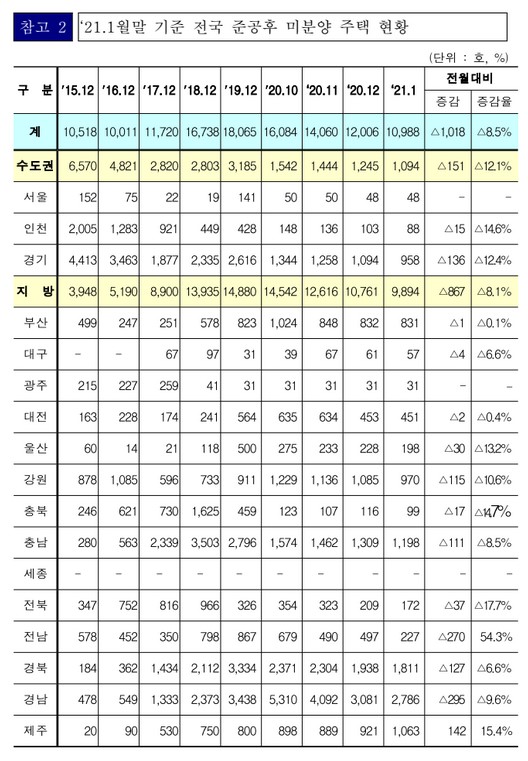 * (수도권) ‘20.1월 4,901호 → ‘20.5월 3,016호 → ‘20.9월 3,806호 → ‘21.1월 1,861호* (지 방) ‘20.1월 38,367호 → ‘20.5월 30,878호 → ‘20.9월 24,503호 → ‘21.1월 15,269호
