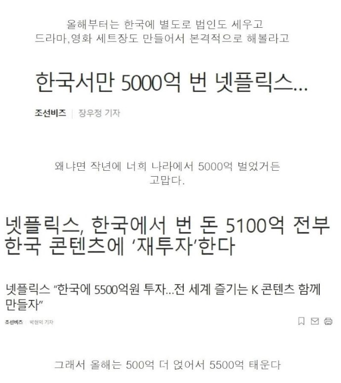넷플릭스, 한국에서 번 돈 5100억 전부 한국 콘텐츠에 재투자 한다.