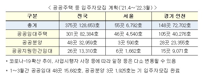 ㅇ 국토교통부(장관 변창흠)은 “21년 공공주택 입주자모집 달력”을 발표하면서, 4월부터 ’22.3월까지 전국 공공주택 375곳 128,653호에 대한 입주자모집을 시작한다고 밝혔다.