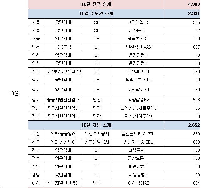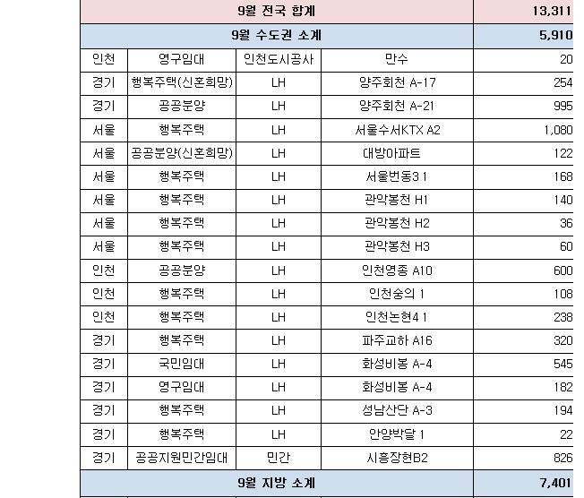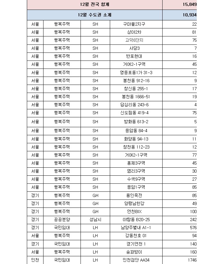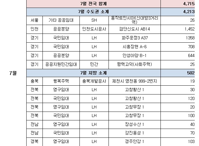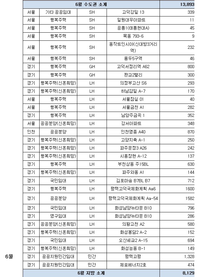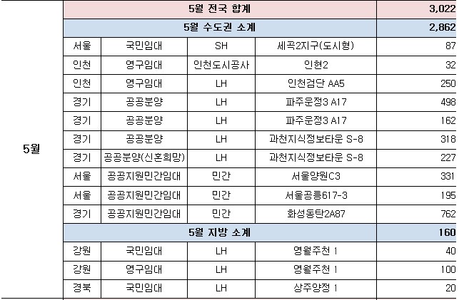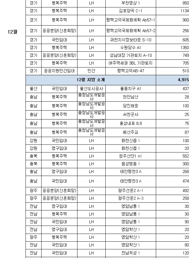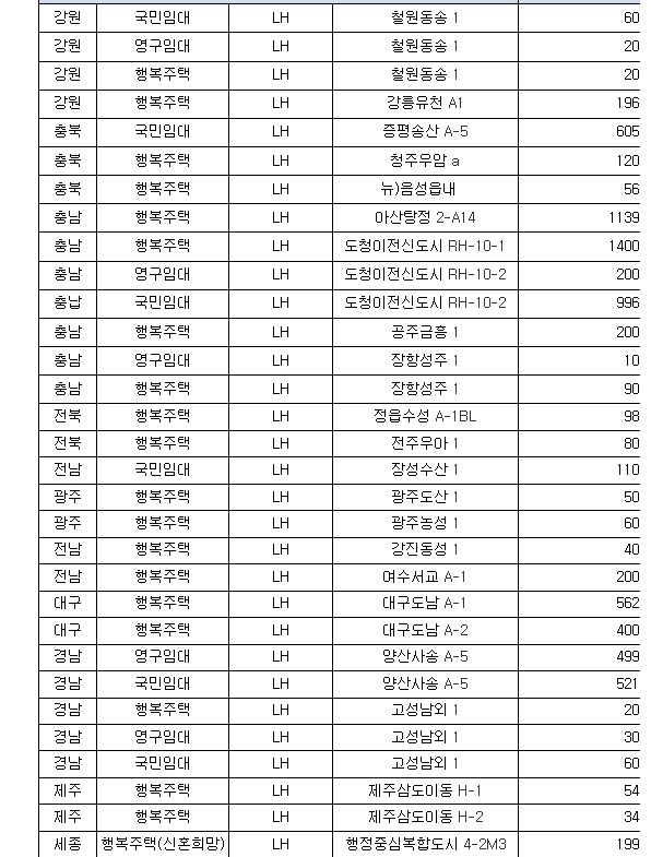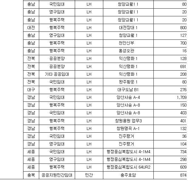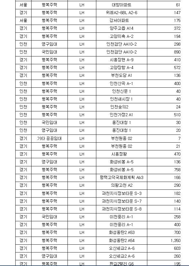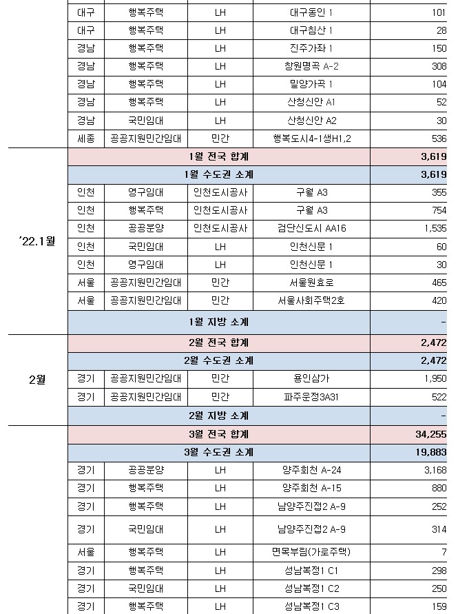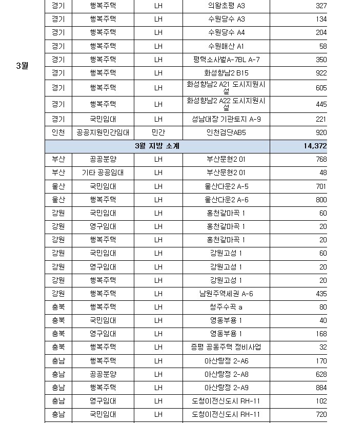 ㅇ (공공임대주택) 경기·인천에서 인천검단(2,746호)·파주운정3(2,052호) 등 105곳 40,276호, 나머지 지역에서 아산탕정(2,935호)·양산사송(1,709호) 등 150곳 37,568호를 공급한다.