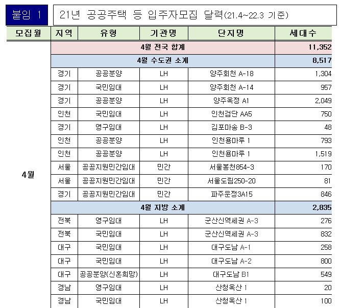 21년 공공주택 등 입주자모집 달력(21.4~22.3 기준)